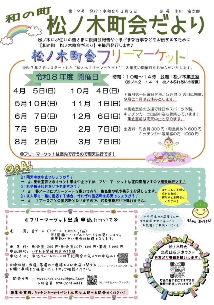 令和8年度 フリーマーケットの予定決定 松ノ木町会 2026.03.29 令和8年度町会フリーマーケットの日程が町会だよりで公表されました。フリーマーケットの他、広場では銀座通りヤナギヤさんによる生ビール・軽食販売やキッチンカーの出店があります。参加申込は前月の15日迄に予約フォーム、メール、公式LINEで受付です。